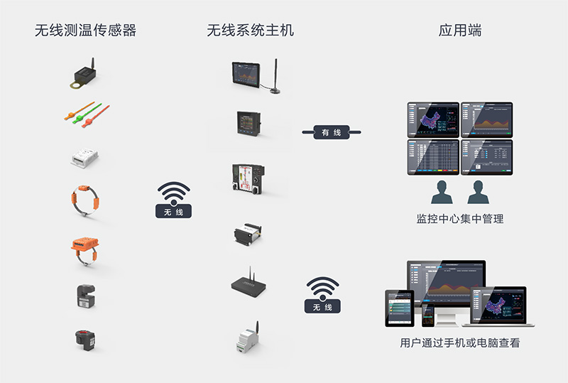 无线温湿度传感器用于测量温度和湿度数据,一般安装在配电箱柜、配电室、配电房及配电所等设备或场所。无线温度传感器由无线发射电路、CPU逻辑控制电路、信号调制放大电路、温度传感器和湿度传感器等部分组成。