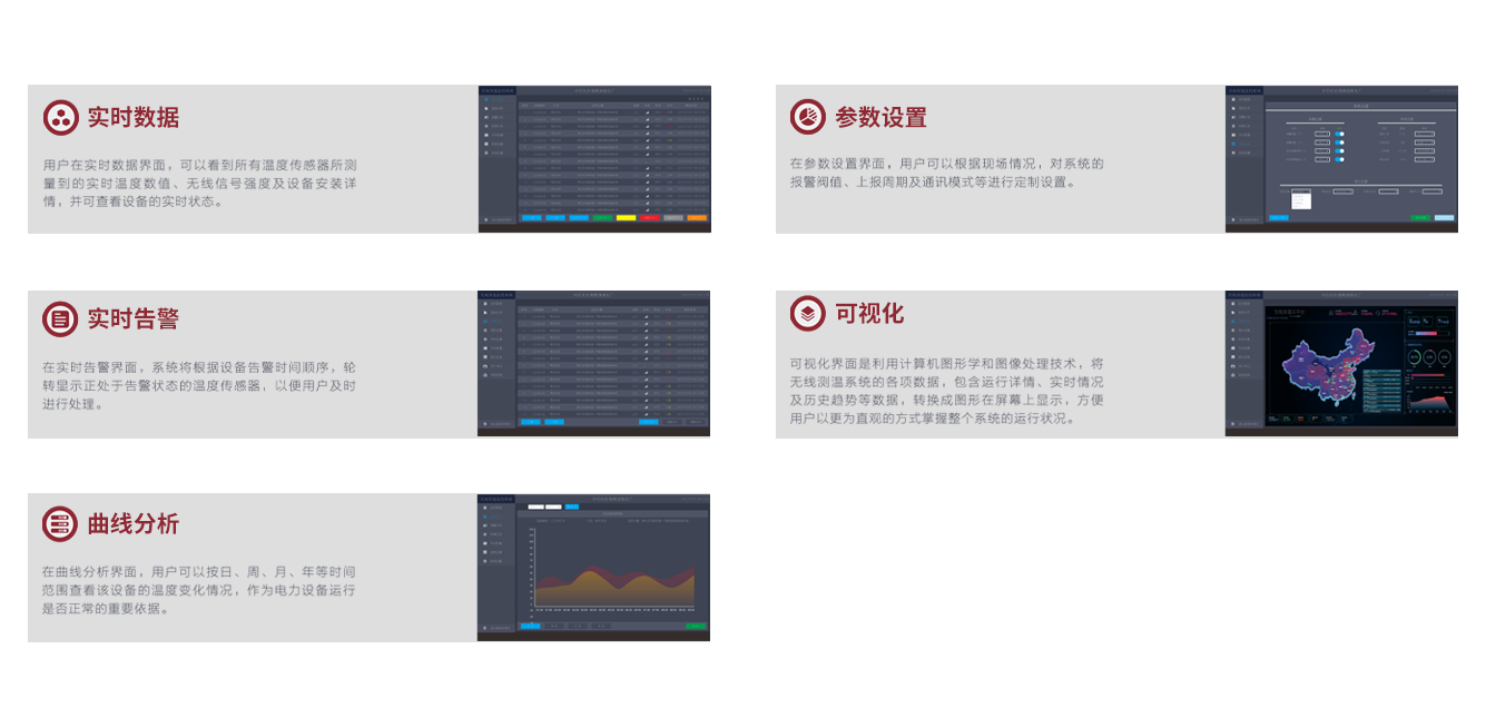 无线测温云平台及应用软件:无线测温客户端软件,实时显示各监测区域监测点的温度数据以及变化曲线,并进行查询分析,一旦发现温度过热、或急剧升温到设置报警温度立即报警,为设备的检修及维护提供参考。